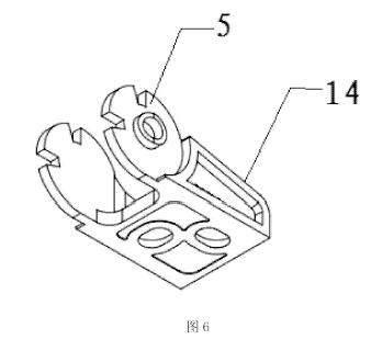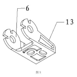 [0023]拖鏈單元I包括底板3,底板3上設(shè)有兩塊相對(duì)設(shè)置且相互平行的立板4,扣板2設(shè)于兩塊立板4遠(yuǎn)離底板3的一側(cè),立板4的一端設(shè)有卡接部5,另一端設(shè)有卡槽6,相鄰的拖鏈單元I之間卡接部5與卡槽6卡接連接,卡槽上設(shè)有圓孔7,卡接部5上設(shè)有用于圓孔7的圓柱8,卡槽6可沿卡接部5以圓柱8為中心旋轉(zhuǎn);