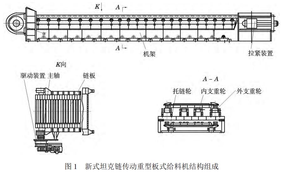 新式坦克鏈傳動重型板式給料機主要由驅動裝置、主軸、鏈板、機架、托鏈輪、內支重輪、外支重輪及拉緊裝置組成,見圖1。實際應用中根據(jù)不同的工況要求設計安裝給料機的長度,與此配套相應數(shù)量的托鏈輪和內支重輪。如長度為9m的給料機,其托鏈輪為34個,內支重輪為44個。新式給料機對輸送物料的粒度、溫度、黏度的變化有更好的適應性,同時具有給料量均勻、漏料少、便于安裝等優(yōu)點,正逐步替代老式AC環(huán)傳動重型板式給料機,在采礦、冶金、建材和煤炭等行業(yè)得到迅速推廣使用。