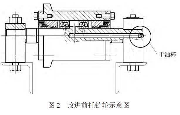 給料機托鏈輪和內支重輪軸承處于設備的中間和底部,潤滑方式均為干油杯潤滑(圖2、圖3),需要人工使用干油槍逐一進行注油潤滑,由于空間狹小,即使是停機狀態(tài)下,人工也無法進入新式給料機內給幾十個托鏈輪和內支重輪進行注油潤滑,只有在停產檢修時,將設備拆開后,用干油槍對托鏈輪和內支重輪注油。費時、費力,且易造成潤滑脂污染,設備運行時軸承往往因缺油而損壞。