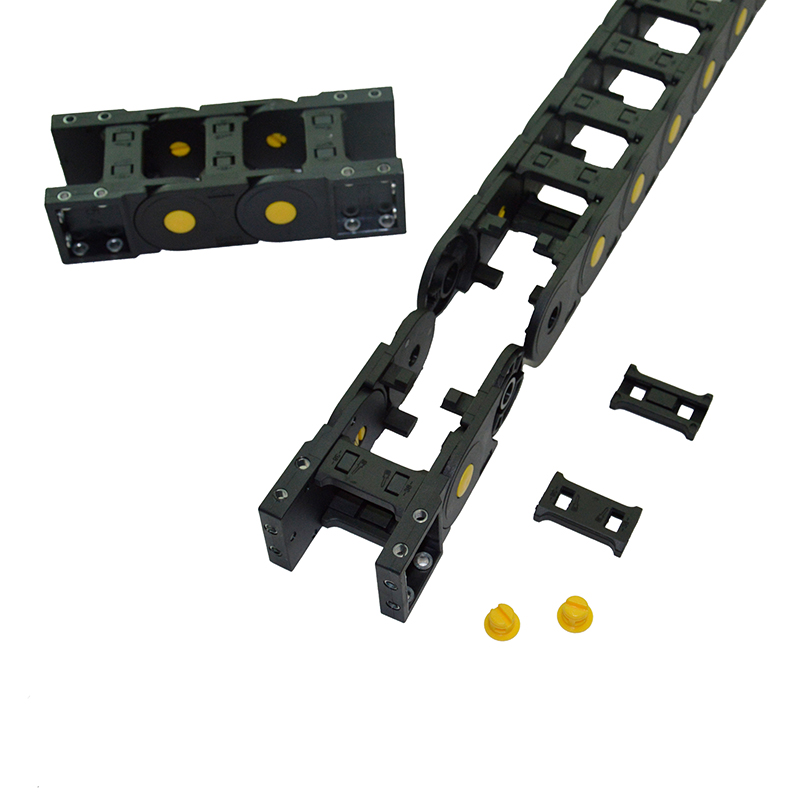 拖鏈采用四片(即兩側主體與上下橫梁或封閉片)組裝起來,四片可以自由打開與組裝。組裝后兩側鏈板用黃扣加緊,使結構更加堅固,在外觀上也更加美觀。