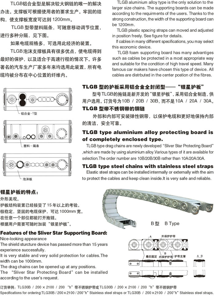 鋼鋁拖鏈制造廠有TL45、TL65、TL95、TL125、TL180、TL225、TL250型,拖鏈寬度可按用戶要求定做,彎曲半徑從50-800之間。有三種支撐板的形式。
